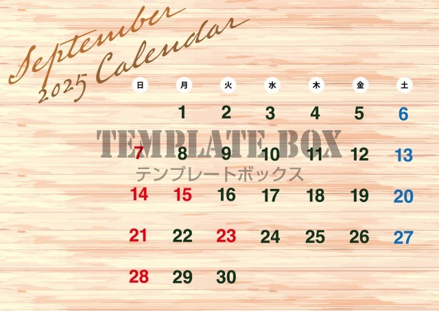 無料テンプレート:2025年9月カレンダー:木目がナチュラルなカレンダーです