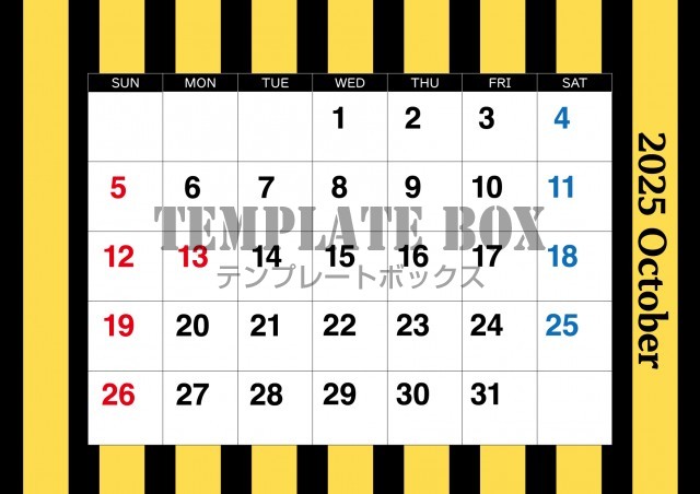 無料テンプレート:2025年10月カレンダー:横型の黄色と黒の派手なカレンダー