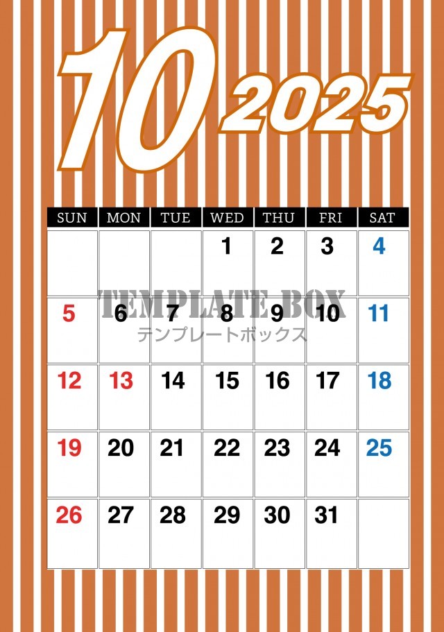 ストライプ柄がおしゃれな2025年10月カレンダーです。シンプルなデザイ…