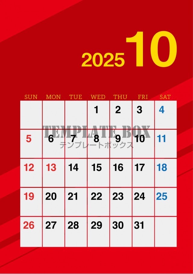 赤いカラーがかっこいいカレンダーです。2025年10月カレンダーです。秋…