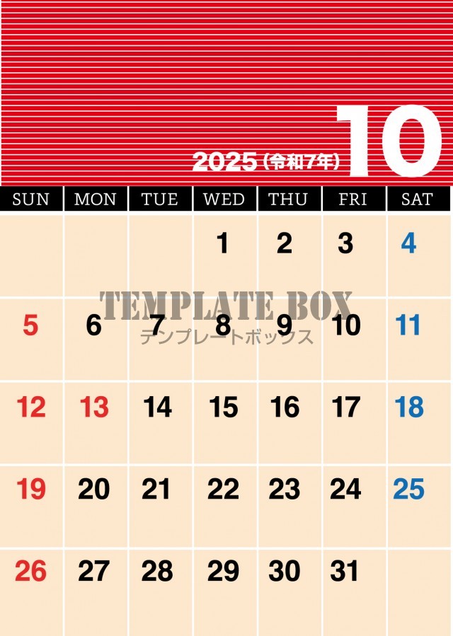 無料テンプレート:2025年10月カレンダー:縦型のおしゃれ配色カレンダー