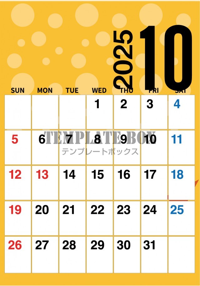 無料テンプレート:2025年10月カレンダー:縦型の水玉模様がかわいいカレンダー
