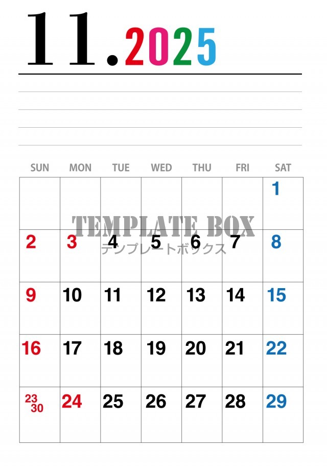 2025年11月カレンダー:横型の予定書き込めるカレンダー