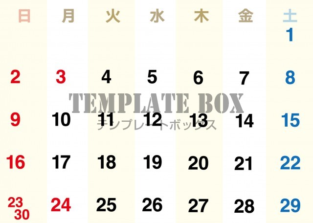 赤いカラーが印象的なおしゃれなカレンダー素材です。曜日もカラフルに色分け…
