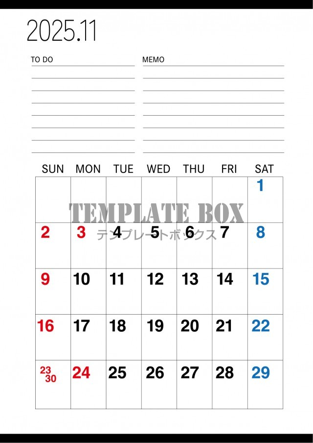 2025年11月カレンダー:シンプルモノクロカレンダー