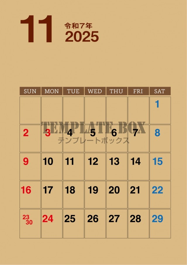 無料テンプレート:2025年11月カレンダー:秋のブラウン系カレンダー
