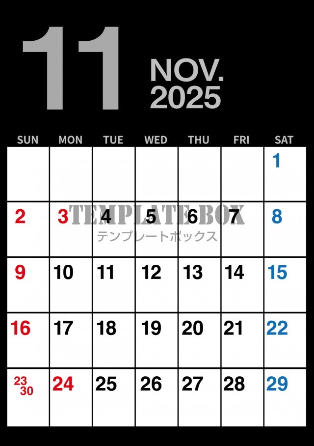 2025年11月カレンダー:縦型のシンプルかっこいいカレンダー