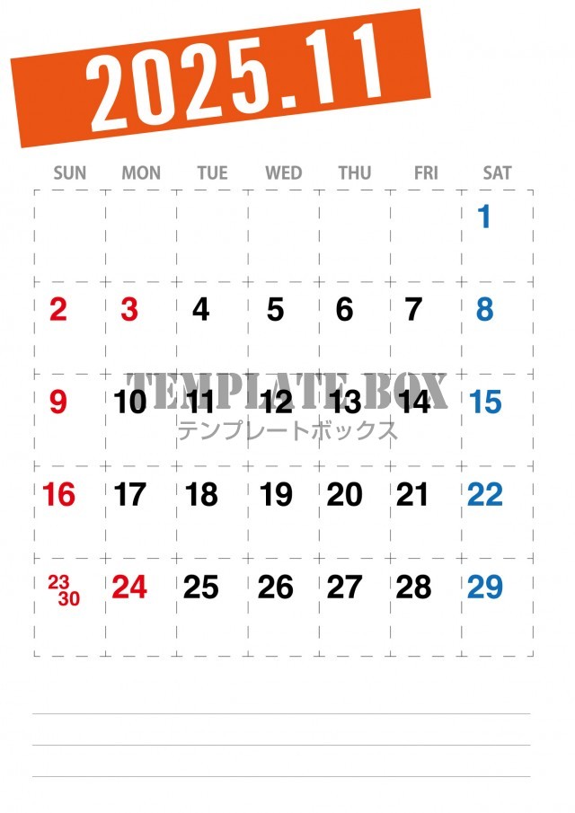 2025年11月カレンダーです。オレンジのカラーがおしゃれなデザイン性の…