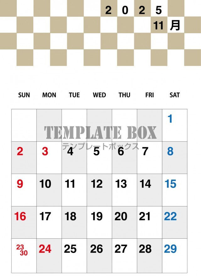 無料テンプレート:2025年11月カレンダー:秋の市松模様柄カレンダー