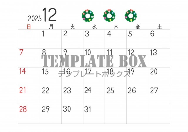 無料イラスト素材:令和7年、2025年、12月の横型のカレンダー素材、クリスマスリースのイラスト付き