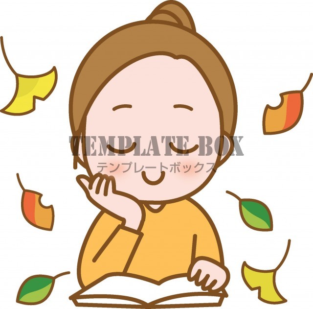 無料イラスト素材:秋のイメージのイラスト素材、読書を楽しむ女性と秋の色づく落ち葉