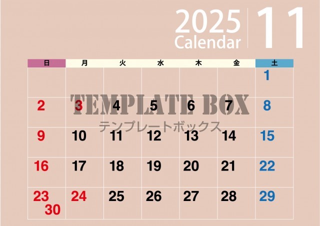 2025年11月カレンダーです。ピンクのカラーが目立つカレンダーです。枠…