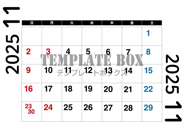 2025年11月カレンダー:横型のシンプルデザインカレンダー