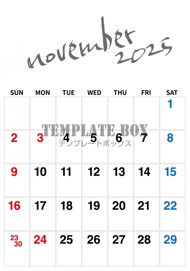 無料テンプレート:2025年11月カレンダー:秋の11月シンプルカレンダー