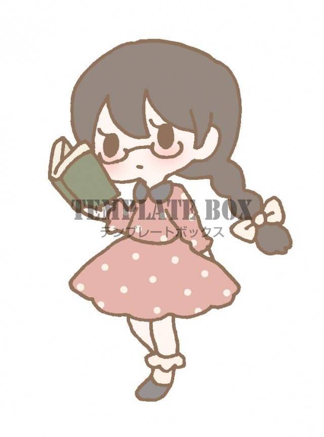 無料イラスト素材:本を読んでいるメガネをかけた三つ編みの女の子のワンポイントイラスト