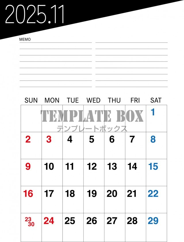 2025年11月カレンダーです。オフィスやご自宅用としてご利用いただける…