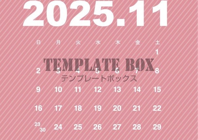 2025年11月カレンダーです。ピンクのカラーが目立つカレンダーです。枠…