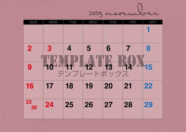 無料テンプレート:2025年11月カレンダー:横型のワインカラーのカレンダー