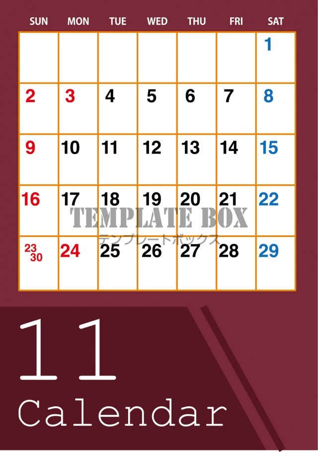 無料テンプレート:2025年11月カレンダー:縦型のワインレッドカラーカレンダー