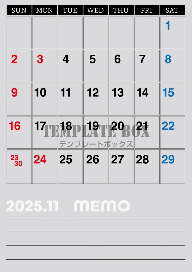 2025年11月カレンダー:グレーのカラーがおしゃれなカレンダー