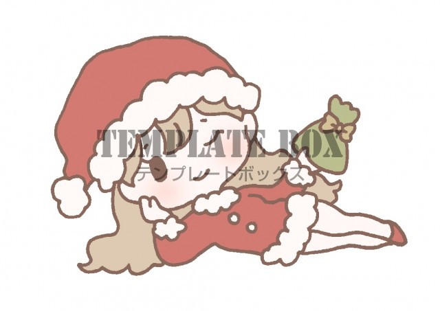 無料イラスト素材:サンタクロースの格好をして寝そべり、プレゼントを持ってウインクしている女の子