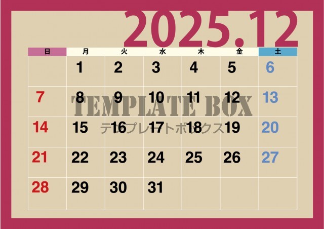 無料テンプレート:2025年12月カレンダー:横型の赤太枠のカレンダー