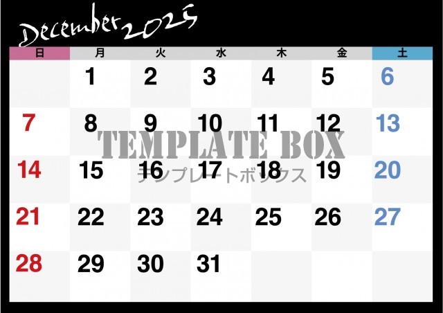 大きな枠が特徴的な2025年12月カレンダーです。シンプルなデザインで場…