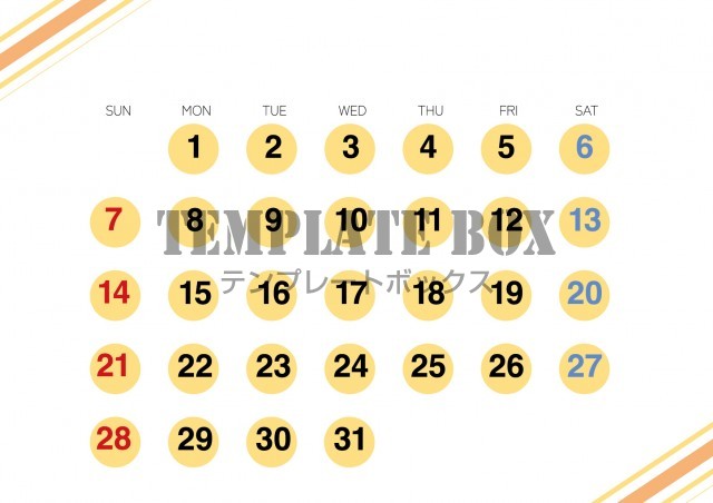 無料テンプレート:2025年12月カレンダー:横型の日付を丸で囲ったカレンダー