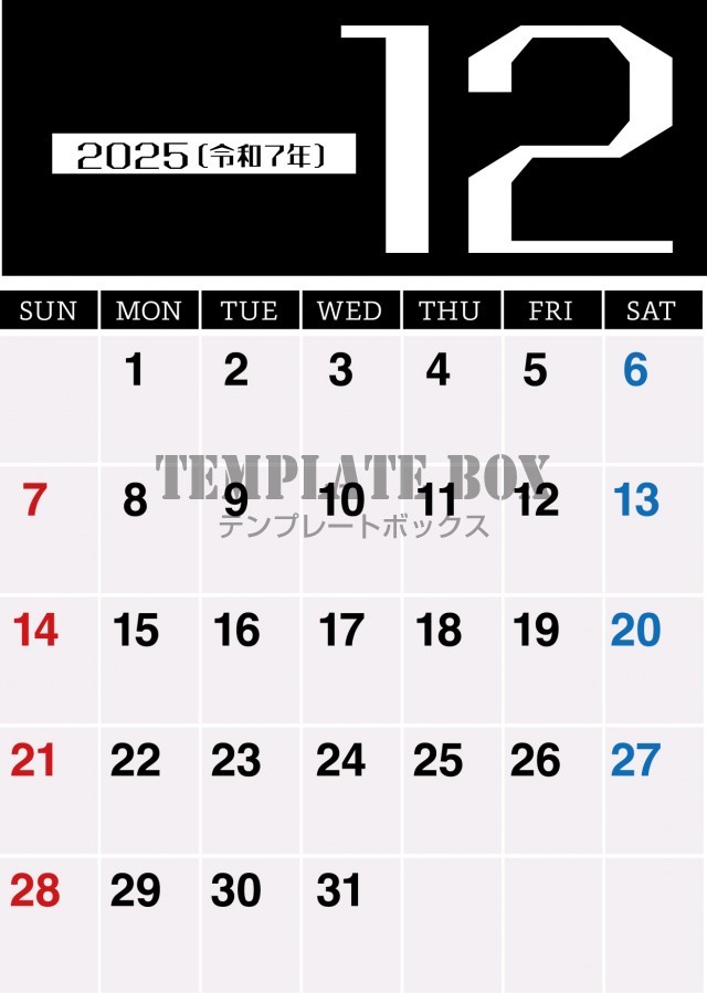 無料テンプレート:2025年12月カレンダー:縦型シンプルビジネス仕様カレンダー