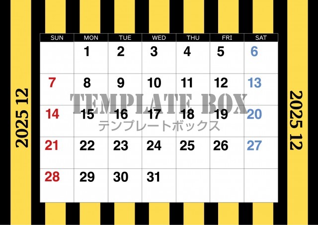 無料テンプレート:2025年12月カレンダー:横型の黄色と黒の目立つカレンダー