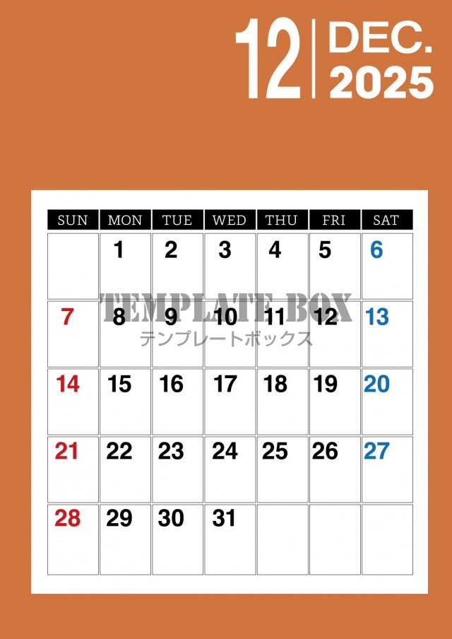 オレンジカラーがおしゃれカレンダーです。2025年12月カレンダーです。…