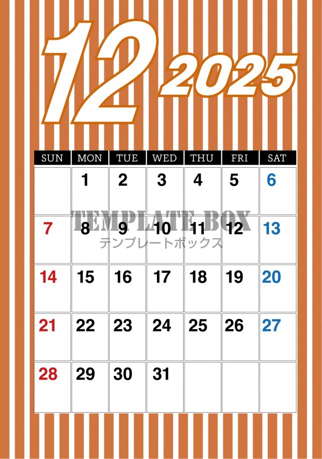 無料テンプレート:2025年12月カレンダー:縦型のストライプ柄カレンダー