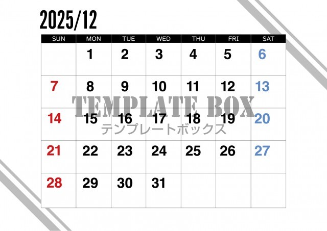 無料テンプレート:2025年12月カレンダー:横型の斜めのデザイン