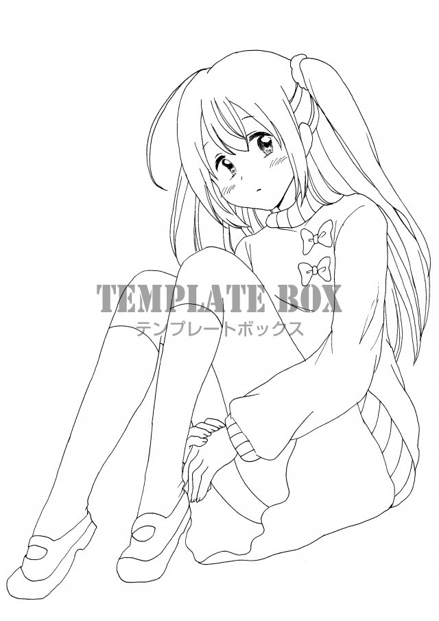無料テンプレート:体育座りのハーフアップツインの女の子のかわいい塗り絵のテンプレート