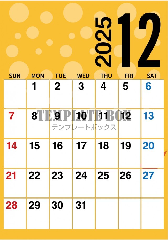 無料テンプレート:2025年12月カレンダー:縦型黄色のモダンカレンダー