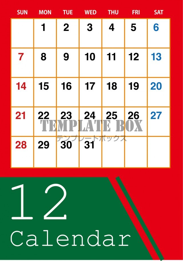 無料テンプレート:2025年12月カレンダー:縦型クリスマスカラーカレンダー
