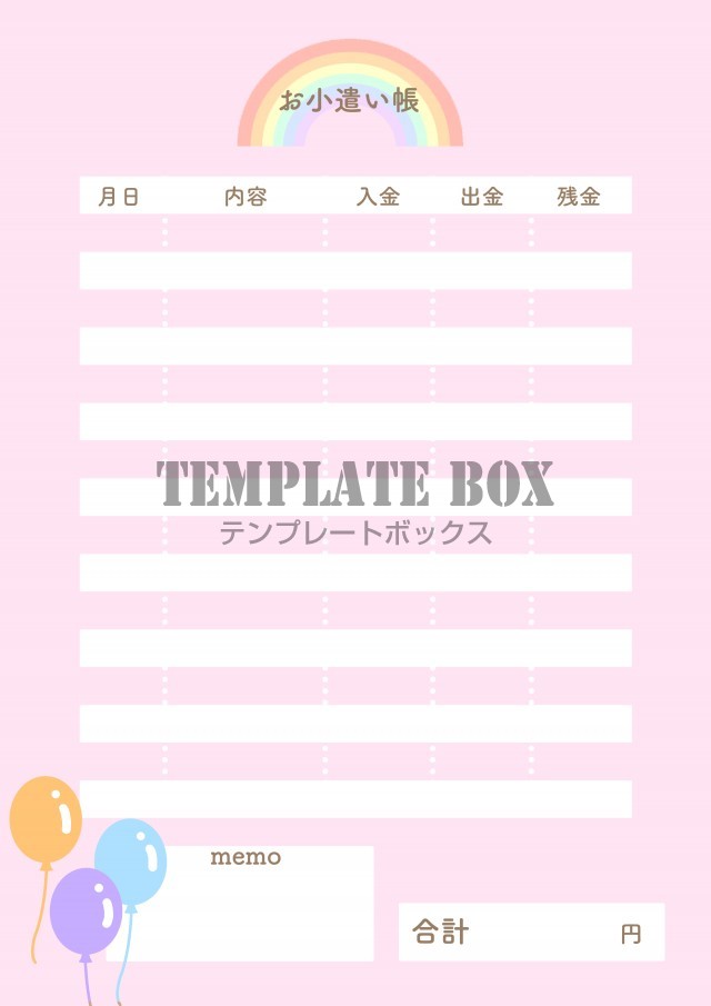 無料テンプレート:虹と風船のイラスト入りお小遣い帳のかわいいテンプレート素材