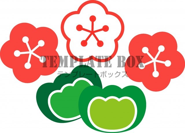 無料イラスト素材:年賀状に使えるイラスト素材、白梅と紅梅と松の木のかわいいイラスト