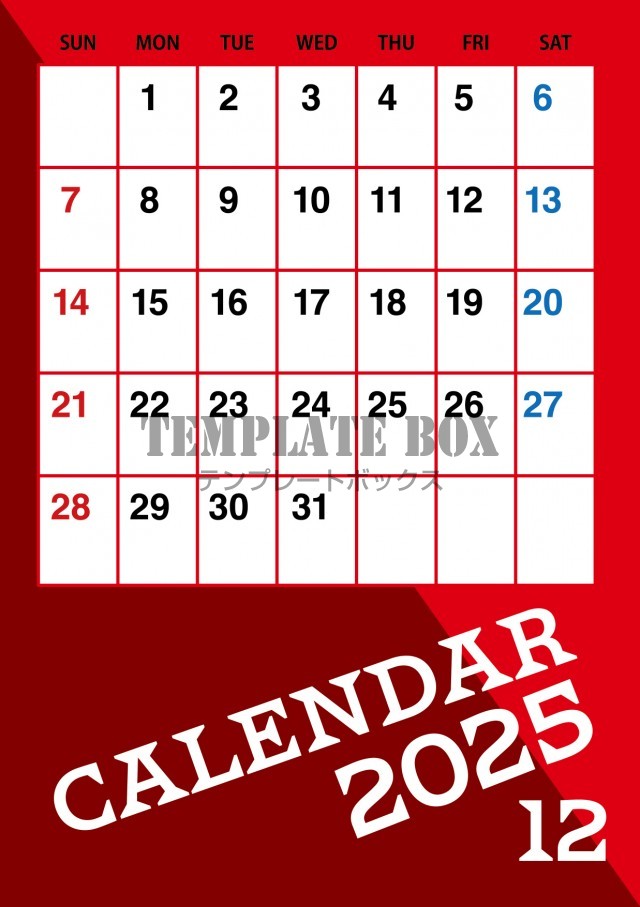 無料テンプレート:2025年12月カレンダー:縦型レッドカラーがベースのカレンダー