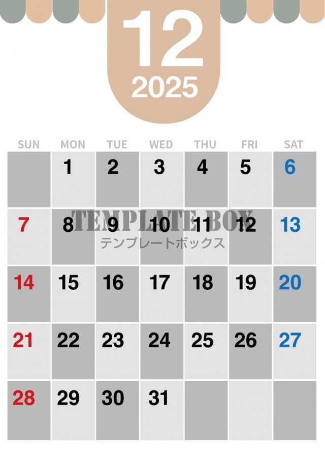 2025年12月カレンダー:グレーカラーのシンプルカレンダー