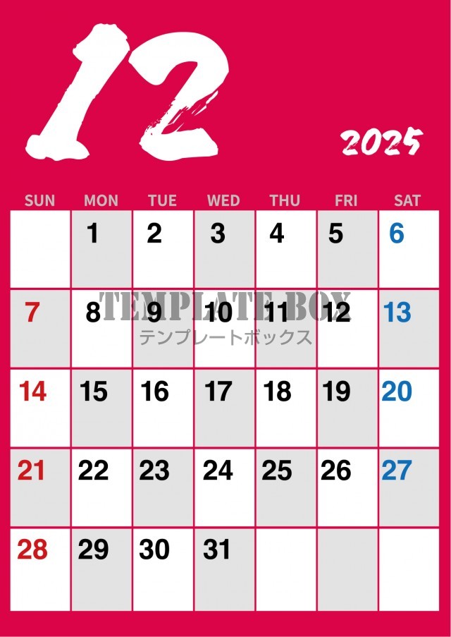 2025年12月カレンダー:グレーカラーのシンプルカレンダー