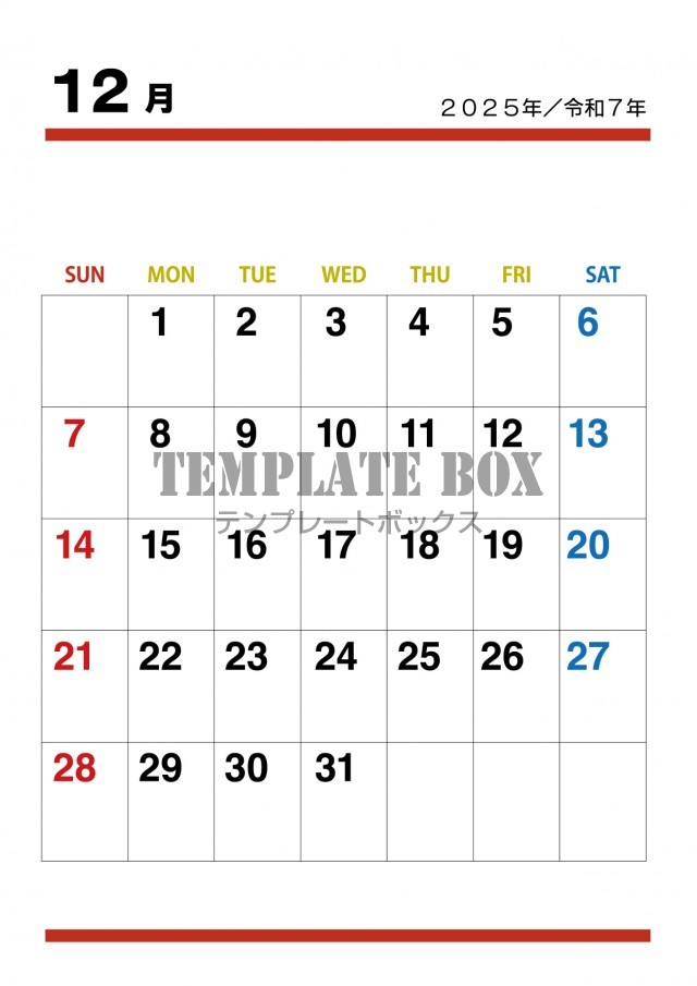 2025年12月カレンダー:縦型レッドカラーがベースのカレンダー