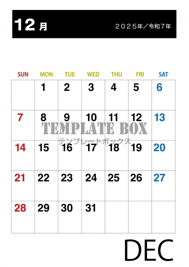 無料テンプレート:2025年12月カレンダー:縦型黒のおしゃれなかれ