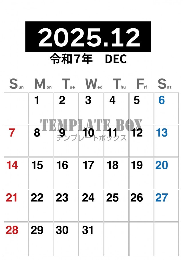 2025年12月カレンダー:縦型のシンプルなカレンダー