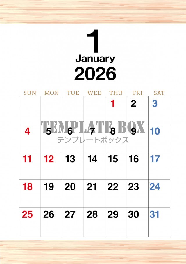 無料テンプレート:2026年1月カレンダー:縦型木目カレンダー