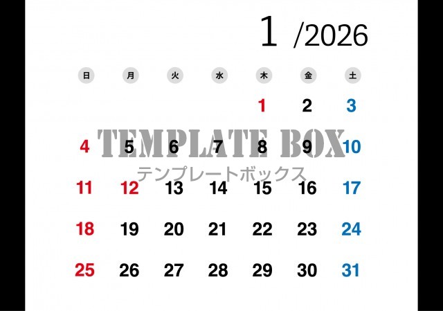 無料テンプレート:2026年1月カレンダー:横型のシンプル便利なカレンダー