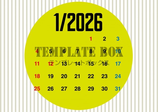無料テンプレート:2026年1月カレンダー:横型のストライプデザインカレンダー