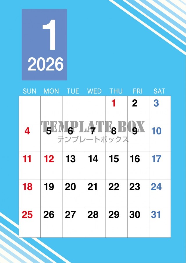 無料テンプレート:2026年1月カレンダー:縦型ストライプ柄カレンダー