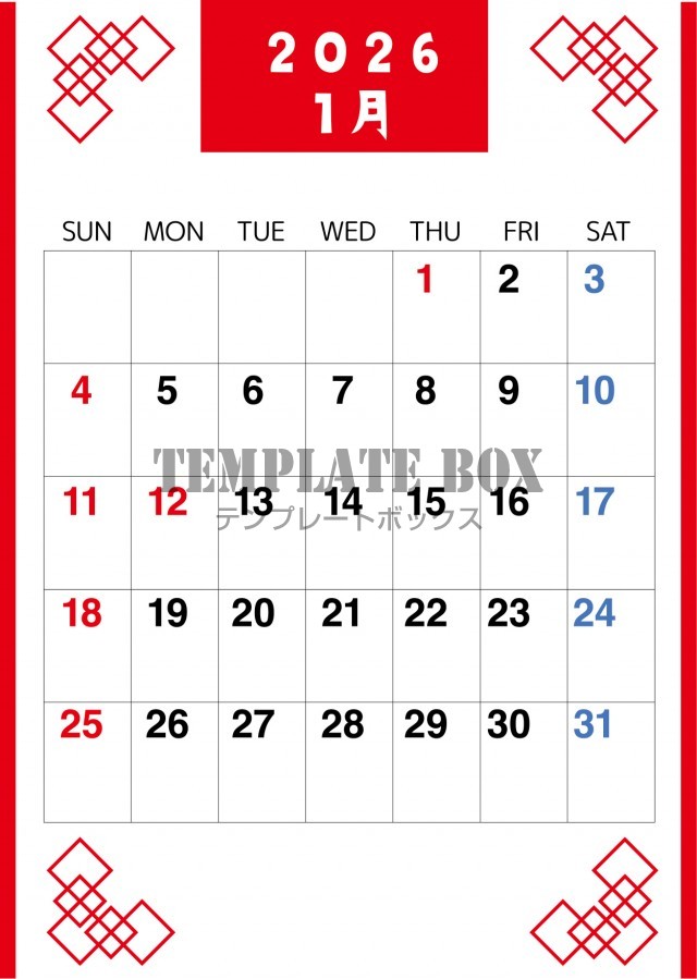 太枠が特徴的なカレンダー素材です。2026年1月カレンダーです。冬の予定…