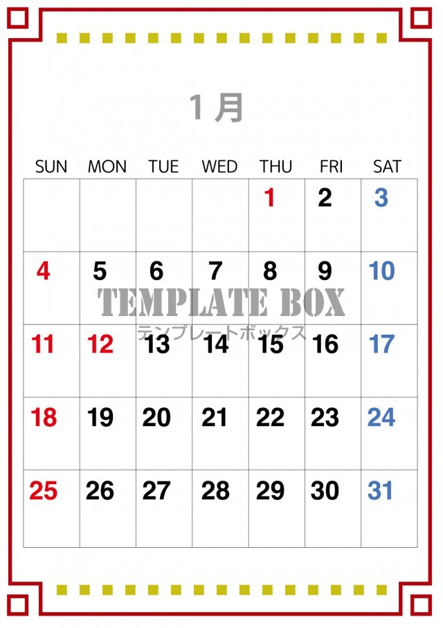 無料テンプレート:2026年1月カレンダー:縦型赤枠おしゃれカレンダー